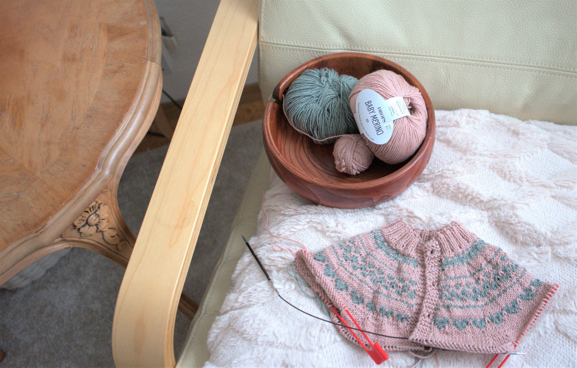 Die Reihen 7 bis 10 werden in Farbe Wüstenrose gestrickt, daher muss Farbe Salbei nicht mitgeführt werden.
